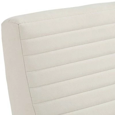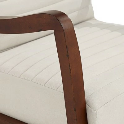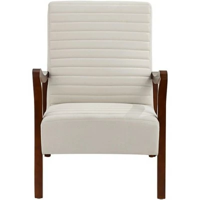 Made for lounging and reading in, this comfortable design is an ideal pairing for a living room, home study or office. From the 55 Downing Street brand, it features a modern profile with bent wooden arms and an open wood frame. The comfy vertical pleated fabric is in a soft cream color, and the frame and legs feature a walnut finish.