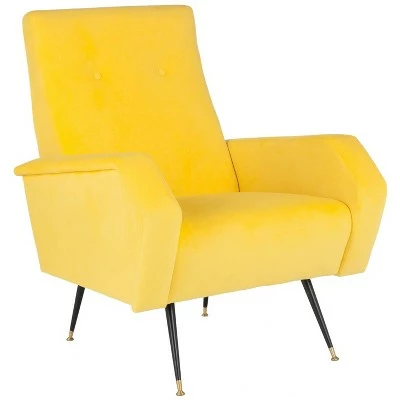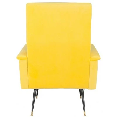 Energized with the optimism of Mid-Century modern style, this retro accent chair was inspired by the iconic furnishings of top American designers. Futuristic angles upholstered in brilliant colored velvet and chic gold cap legs make it a design classic. Constructed from Eucalyptus wood and black colored iron, this retro styled accent chair is able to support up to two hundred and seventy five pounds. The Aida accent chair is the perfect chair for Contemporary, Glam, Mid-Century, or Modern style interiors.
