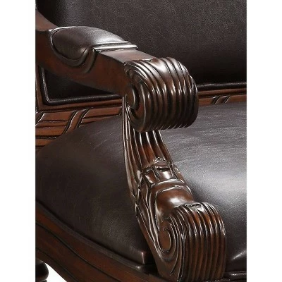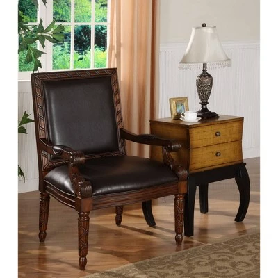 This accent chair has plenty of style in a traditional and attractive package, making the perfect addition to your home. Intricate and extensive hand carvings add stately appeal to the Medium Brown finish of this chair. The back, arm pads and comfortable seat are covered in a durable Leather-like Dark Brown color for a warm, traditional feel.