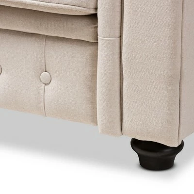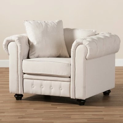 The low profile and plush rolled arms of the Alaise are the epitome of sophistication. This modern and classic-inspired chair is built to last with a wood frame and resting on four finished bun feet. The Alaise is an updated take on the Chesterfield style with button tufting on the arms, back, and front panel. The chair back and arms are foam-padded and upholstered in fabric for optimum comfort. The cushions of the Alaise are removable and comes with one matching pillow. of gorgeous details, subtle fabric piping outlines the chair. Add class, style, and a cozy place to lounge to your living room or any shared space. Made in China, the Alaise requires assembly. Dimensions: 28.38″ High x 43″ Wide x 36.25″ Deep; Seating Dimensions: 18.25″ High (from Floor) x 23.5″ Wide x 19″ Deep; Arm Height: 11″ High; Height (from Floor to Top of Arms): 28.38″ High; Back: 14.63″ High; Legs: 3″ High; Back Pillow: 14.63″ Wide x 24.5″ Long x 6.5″ Thick; Pillow: 18.63″ Wide x 18.63″ Long x 6.5″ Thick