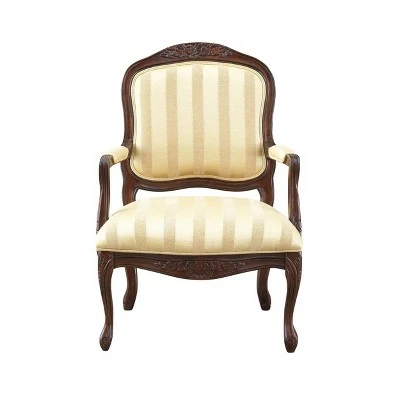 Lots of intricately hand-carved details adorn this classic and beautiful chair. The Dark Brown finish calls attention to the beautiful curves of the back, legs and feet which creates a dramatic contrast to the luxurious Beige and Cream Satin Stripe of the upholstery. Combined, these details add up to timeless accent seating and comfort.