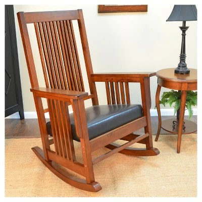 The clean, classic look and detailing of this Mission-style furniture is unmistakable. Our Thomas Mission rocking chair makes a relaxing addition to any seating ensemble. Crafted of select hardwoods in a rich chestnut finish, this chair features a clean-lined, high back and fixed arms adorned with vertical slat details, while two curvy gliders let you rock back and forth with ease. Rounding out the design, the firm foam-cushioned box seat is upholstered in easy-to-clean faux leather for a handsome finish.