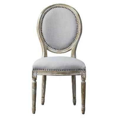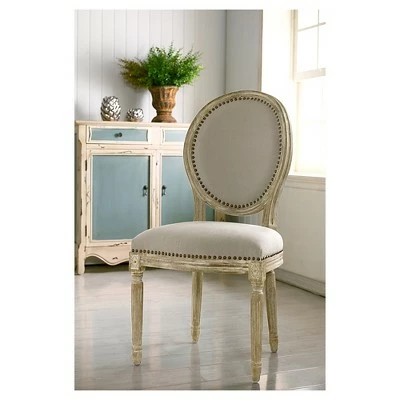 Revealing outstanding attention to detail via its white-streaked, distressed antiqued finish, our Clairette Wood Traditional French Accent Chair—Round will garner enthusiastic applause from discount-minded decorating divas. This accent chair pairs a genuine birch frame with a graceful oval chair back. Highly versatile neutral beige linen is adorned with bronze nail-head trim. Foam cushions provide comfort while a repeated floret motif heightens the elegance factor. Oh la . 40″ high x 19.25″ wide x 20″ deep , Seat dimensions: 19″ high x 19.25″ wide x 20″ deep