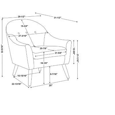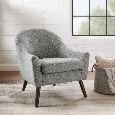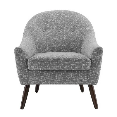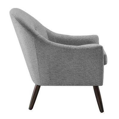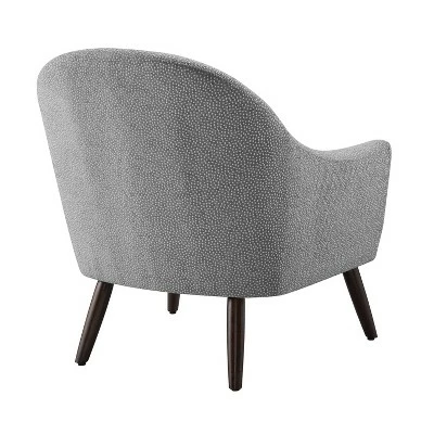 Open and accessible, the subtle curves flow throughout this accent chair. Elegantly upholstered with a soft to the touch fabric in a soft gray colored fabric and overall dot pattern that is easily at home in the living room, bedroom, office or den. Contoured wood legs finish off this mid-century modern silhouette. Padded seat and arms will make this the favorite chair in any room.