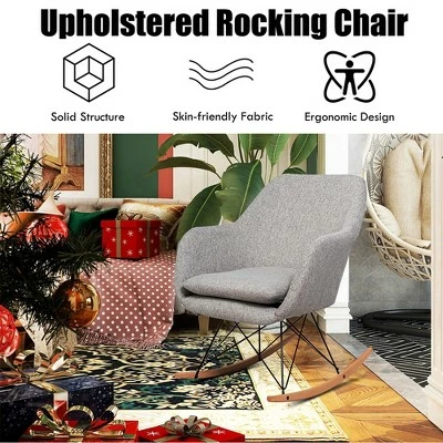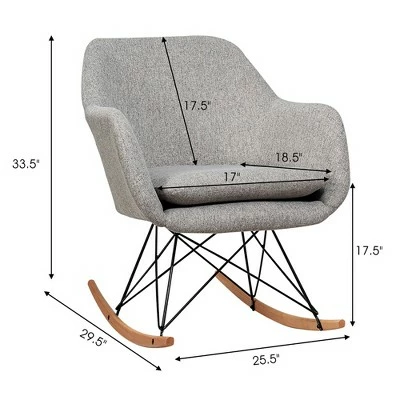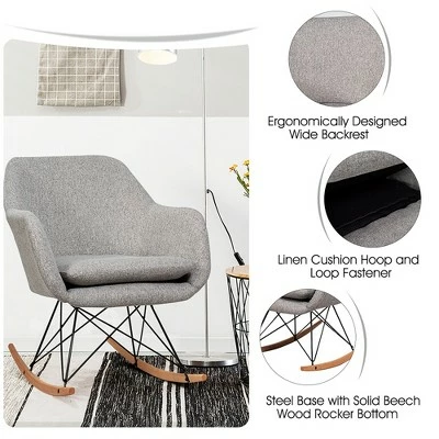 This stylish rocking chair can not only provide you a relaxing place, but also decorate your house better.. Covered by linen fabric and constructed by steel and beech wood, this single chair is comfortable, durable and stable. You will sit comfortably and feel relax with 3” cushioned seat and cozy armrests. The specially designed arc base with perfect angle can effectively help you relax your body, thus you will have a super smooth and comfortable rocking experience. High quality wood frame ensures long-term service, so that the massage rocking chair is strong enough to withstand the weight of 250 LBS.. Specification: Color: Grey. Material: Beech wood, Sponge, Linen . Overall Dimension: 25.5” x 29.5” x 33.5” (L x W x H). Net Weight: 16.5 lbs. Load Capacity: 250 lbs. . Package Includes:. 1 x Rocking Chair . 1 x Assembly Instruction.