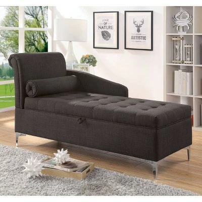 Come home and kick back on this lovely transitional chaise. It includes a seat that lifts to reveal hidden storage perfect for tucking away blankets and accessories. The chaise boasts rich gray fabric over a rolled back and angular arm, with button tufted that lends rich dimensionality to a sophisticated presentation.