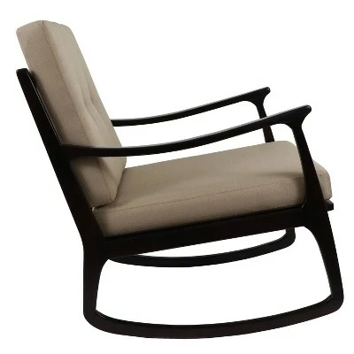 Modern lines blend with traditional functionality in this stylish, sharp rocking chair. The wood frame in a dark finish is slim with smooth, soft curves, which contrasts slightly with the cushions. Square in shape and featuring an allover crosshatch texture, these two cushions are positioned at the seat and back, with tufted buttons adding to the traditional appeal. A slatted frame back creates comfort and finishes the look.