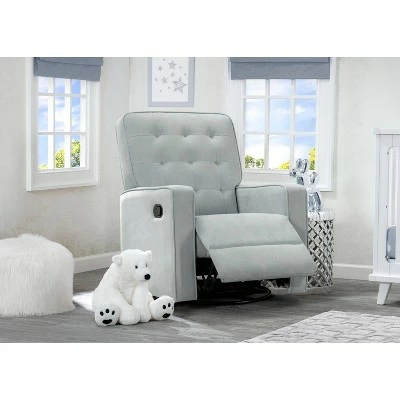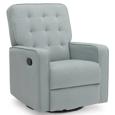 Ideal for story time or late-night feedings, the Delta Children Gavin Nursery Glider Swivel Recliner featuring LiveSmart Fabric by Culp will become the ultimate hangout spot for you and your baby. The chair features plenty of ways to unwind, it has a 360-degree swivel, gliding motion, and an easy-to-reach reclining mechanism that offers two recline positions. You can keep the seat upright and just prop up your legs or fully recline for maximum relaxation. Upholstered in the most durable fabric on the market, this recliner features LiveSmart technology, which allows spills to bead up, sitting on top of the fabric until you gently blot them away. The fabric does more than prevent stains and repel moisture–it resists everyday messes to keep the chair looking as beautiful as the day you bought it. And that’s not all, this versatile recliner works well in the nursery or any other living space in your home. Its sophisticated design with buttonless tufting and streamlined silhouette makes it a timeless choice. The Delta Children Gavin Nursery Glider Swivel Recliner featuring LiveSmart Fabric by Culp is available in a number of versatile neutrals that work well with everything.