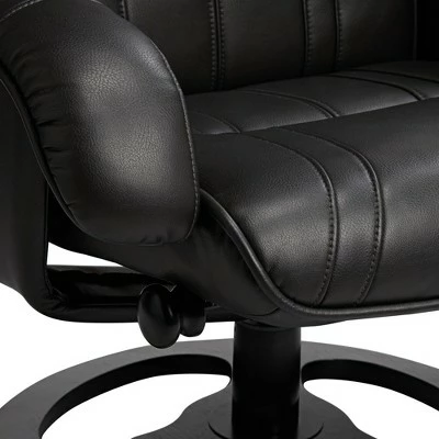This contemporary black leather recliner and ottoman set is a must-have for your modern living room space. Its black base is offset by rich black leather on the recliner and ottoman. Swivel and recline to your preference on the chair, and rest your feet on the detached ottoman.