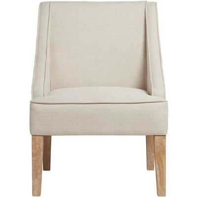 A contemporary-style upholstered armchair that’s perfect for living room, dining room, and seating area use. This stylish design comes in a clean ivory fabric and features dramatic swoop arms. The brown wood legs are a lovely contrast that adds to the look.