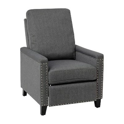 This transitional recliner with luxury detailing will make a statement in any room in your home. Featuring durable fabric upholstery in gray with nailhead accent trim for a modern feel and plush padding for ultimate comfort, this recliner is the best of both worlds. Wooden legs ground the design and offer a natural look. The easy push back recline feature gives you freedom to place this piece without worrying about an available outlet or accommodating a lever. With assembly taking less than 10 minutes, you don’t have to wait to put your feet up and unwind from the pressures of your day. For lasting use, spot clean when needed with a neutral detergent and water. When you need a place to relax, this recliner will provide maximum comfort without sacrificing high style or breaking the bank. Additional Features: Spot Clean with Mild Detergent and Water