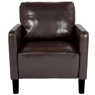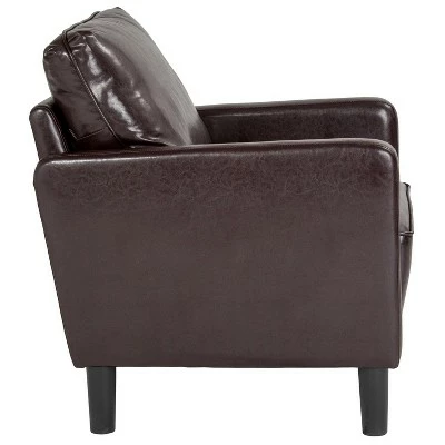 Give your living space that old school, cozy look and feel with this single seat brown LeatherSoft upholstered arm chair with extended side panels. Generously padded with with 4.5 inches of CAL 117 fire retardant foam, this faux leather accent side chair will add a refined look to your home furnishings. An oversized back cushion is removable for cleaning and has a hook and loop system to keep it in place. The fixed seat cushion stays in place to prevent slippage for a neat, clean look. Upholstered track arms allow you to relax and relieve pressure from your neck and shoulders. Sinuous steel wire seat springs provide an excellent seating experience while soft and durable LeatherSoft upholstery adds warmth and comfort that will make guests feel welcome. High rounded black plastic legs not only enhance the look of this reading chair, they also make it easier to sweep, mop or vacuum underneath. Spills and other messes clean up easily with a water based cleaner. Purchase two chairs to make an easy conversational setting or pair with our glass coffee table to complete the look. Additional Features: Generously Padded with CAL 117 Fire Retardant Foam, Sinuous Steel Wire Seat Springs for a comfortable seating experience, Rounded Black Plastic High Legs makes it easy to sweep or vacuum underneath, Spot Clean with Water Based Cleaner to remove spills, LeatherSoft is leather and polyurethane for added Softness and Durability