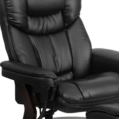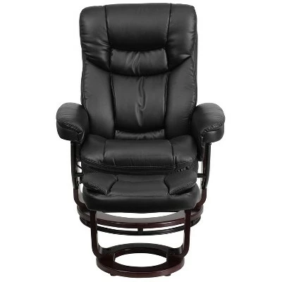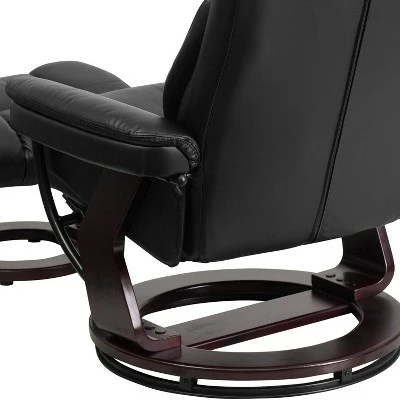 Get cozy and relaxed with this LeatherSoft upholstered recliner chair and ottoman set. Turn on your Egyptian oil diffuser, add some rejuvenating eye gels, and your microwavable neck pillow and let go of the day. Covered in soft and durable LeatherSoft upholstery, our reclining chair and ottoman set lends elegance to any room. A neutral light color complements any décor. Ample foam padding in the seat, back and armrests creates an exceptionally plush feel while the integrated headrest helps support your whole body. The base of this swivel recliner and ottoman set is crafted from sturdy wood and finished in a rich mahogany color. Ball-bearing construction in the base creates a smooth swivel movement. Modify the position of your recliner from upright to full recline with the lever located just below the right arm. Keep your hard flooring surfaces protected with the built-in floor glides. Additional Features: Ottoman Size: 19.75″W x 18″D x 16.25″H, Recliner Chair has Ball-Bearing Swiveling Wood Base with Floor Protector Glides, Spot clean with damp cloth, LeatherSoft is leather and polyurethane for added Softness and Durability, This product cannot ship to Canada