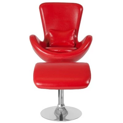 This high back reception chair will add an attractive detail to your lounge or office. This chair is highlighted with an outer lumbar pillow that provides lower back support and a swivel seat. Curved wing sides provide a stylish arm detail. The ottoman will keep you relaxed by kicking up your feet. The round chrome bases feature a plastic ring to protect flooring. Guests will be charmed at the contemporary seating with the added comfort. Please your guests with stylish seating that is made for comfort. Additional Features: Pillow Size: 12-13″W x 8-10″H x 2″ Thick, Seat Cushion, CA117 Fire Retardant Foam, Swivel Seat, Chrome Base, Base Diameter: 21.5″, LeatherSoft is leather and polyurethane for added Softness and Durability, Ottoman Size: 19.5″W x 15″D x 17.5″H