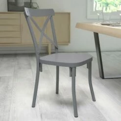 Add a comfortable, welcoming look to your restaurant, bistro or your dining room table with this natural finished metal cross back chair. This versatile chair will work well in any design scheme from farmhouse to open concept to industrial. Pair this X-back chair with any style dining table for a chic, eclectic look that adds a unique design element. Chair arrives fully assembled making setup quick and easy. Ultra-strong, this steel dining chair holds up to 500 pounds to accommodate most users. This cross back dining chair features welded joint assembly for strength and a powder coated frame for long-lasting durability. Plastic floor glides will protect your flooring from damage and ensure smooth movement. Use this chair as a standalone for extra guest seating, add another for a cozy conversation area or purchase enough to fill the spaces around your dining table. Spills clean easily with a water based cleaner. No matter what your design style, this metal X-back kitchen dining chair will be a crowd pleaser. Additional Features: Back Size: 18.25″W x 18″H; Seat Size: 17″W x 16″D x 17.5″H, Chair Ships Fully Assembled and Ready to Use, Industrial style chair ideal for your restaurant, café, kitchen, dining room or as extra seating for guests