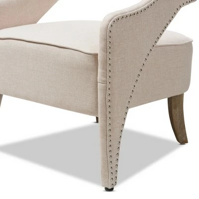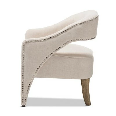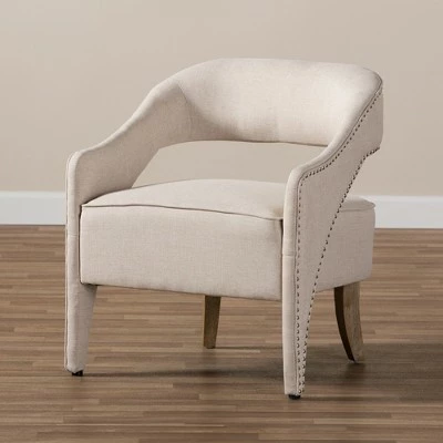 The gentle, swooping curves of the Floriane lounge chair invite you to relax in style. The modern and contemporary-inspired design incorporates smooth, curvaceous shapes with sophisticated details. The Floriane is upholstered in a delightful fabric from the chair back all the way down to the front legs, while the back legs are solid oak in a natural finish. The chair is foam-padded for comfort, with a curved chair back and arms to encourage hours of lounging. The Floriane also features a silver finished nailhead trim and subtle piping for extra details. This chair with an open back design will add modern vibes to your livingroom, reception area, or other shared spaces. Made in China, the Floriane comes fully assembled. Dimensions: 30.71″ High x 26.38″ Wide x 25.59″ Deep; Seating Dimensions: 18.9″ High (from Floor) x 22.05″ Wide x 19.69″ Deep; Arm Height: 4.33″ High; Height (from Floor to Top of Arms): 22.05″ High; Back: 12.2″ High; Legs: 9.45″ High