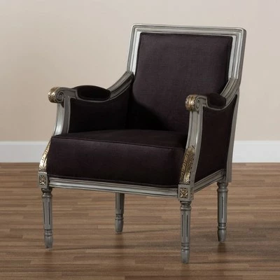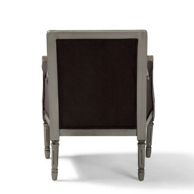 Sumptuous velvet upholstery is paired with luxurious gold-leaf detailing to give the Georgette armchair an air of opulence. Constructed from solid mahogany wood, the Georgette displays a stunning gray finish enhanced with a dark patina for an aged look. The chair is upholstered in a soft velvet fabric comprised of an elegant brown hue interwoven with gray threads. Thick foam padding on the seat and armrests provide ample comfort. Inspired by classic French furniture, the Georgette features an exquisitely carved frame enhanced with gold-tone leaf motifs, as well as fluted legs. The Georgette armchair is made in Indonesia and requires assembly.