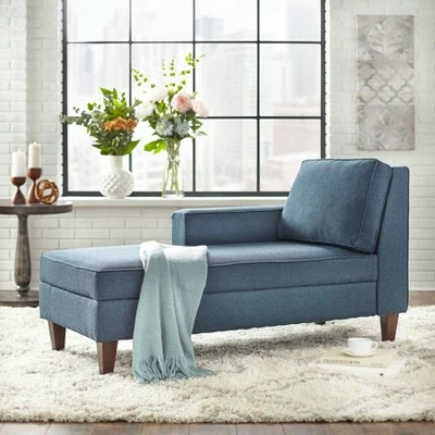 Enhance your living room with this Ginger storage chaise. This fashionable chaise doubles as storage, allowing you to hide extra pillows, blankets and more. The entire seat flips open, revealing ample storage space inside. Upholstered in a Stone, Gray or Blue textured fabric with tapered wood legs. Removable back cushion.