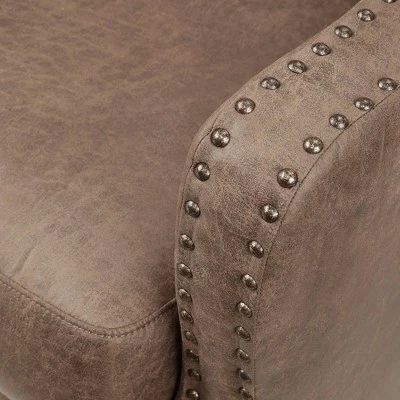 The Shasta Accent Chair introduces a rich and handsome look to your living space. This accent chair is upholstered in faux leather and accented with brass nail buttons, for a stately appeal. The solid hardwood frame and removable foam cushion provide exceptional support and comfort, making it perfect to relax in. A Morocco wood finish on the straight legs complements the brown faux leather to complete the look. Place this accent chair in your living room or home office to give it a sharp sense of style. Leg assembly is required. Max weight capacity 300 lbs.