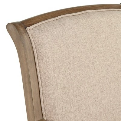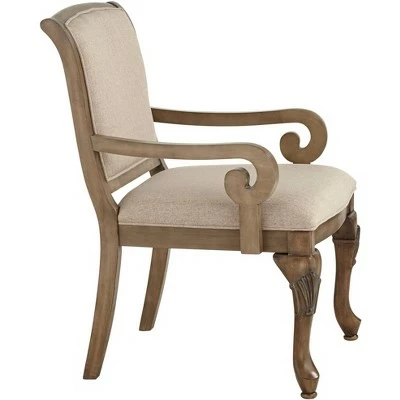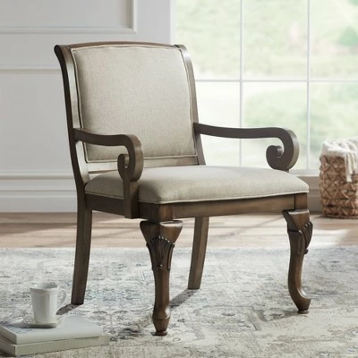 This upholstered accent chair comes from the Kensington Hill brand of designer furniture. Featuring a beige wooden frame with scrolling arms and decoratively carved legs, this elegant design is a great way to add graceful, vintage style to your living room and other areas. Beige fabric upholstery adds a gentle look and feel.