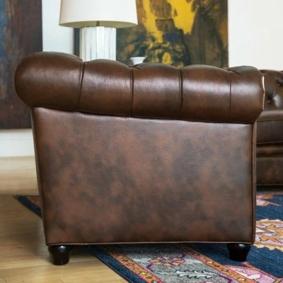 An Abbyson icon this piece is perfectly proportioned with its curving arms, button tufting and luxuriant leather upholstery that is finished with intricate hand-stitched detailing. Its durable kiln-dried hardwood frame is handled with a great deal of care and is put together by a unique and highly skilled craftsman to ensure longevity and strength as well as long-term comfort and satisfaction. Each cushion is fully padded with plush high-resiliency foam cushioning that is wrapped in a Dacron fill for massive comfort and support. Give your home a dose of exquisite style and comfort with this Abbyson favorite.