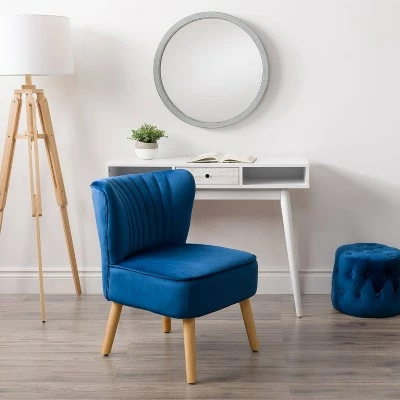 Looking to add an accent chair to your living room or bedroom? Upholstered in a soft and rich velvet this armless chair brings a modern feel to any space. The Channel tufting paired with the flared back adds to the chic style of this versatile chair. Finishing the look with four solid wood tapered, legs that add stability to this multifunctional piece.
