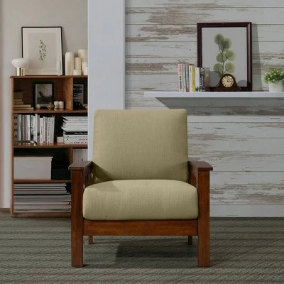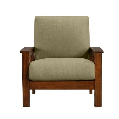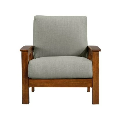 This Maison Hill arm chair boasts an updated transitional design that will elevate your home. The chair features comfortable box cushions in a linen-like fabric on a wood exposed frame with a cherry finish that evokes a modern mission style feel. Ideal for small space living, this chair will be just what is needed to update a living room, office, den or rec. room.