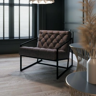 Settle into contemporary style while remaining comfortable in this modern style lounge chair ideal for bedrooms, home offices, and any other living spaces that request a chic persona. Dressed in black faux leather, this minimalist lounge chair features a tufted back and slanted arms accentuated by a sleek dark gray metal frame. Additional Features: Constructed With 1″ Square Tubular Frame, Item Size: 29″W x 31.75″D x 27.5″H