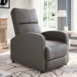 This contemporary recliner celebrates style and comfort in a modern design. This finely upholstered recliner delivers reliability through the durably crafted wood frame. Generous foam and fiber batting cushion provides the ultimate in comfort. The four sturdy legs give the recliner a grounded stability and the padded, slightly angled backrest makes it a treat to lean back and relax in any living room