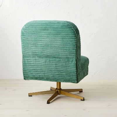 Anyone with a taste for colorful, stylish furniture is sure to love this Spaulding Channel Velvet Accent Swivel Chair from Opalhouse™ designed with Jungalow™. Its thick cushioning is upholstered with striped grooves in soft, teal green fabric to give your home a lounging spot that’s warm, comfy and charmingly colorful all at once. This bold design is complemented by the chair’s swiveling, brass-finished base. Great as a standalone piece, it also coordinates nicely with other bohemian-style furniture.