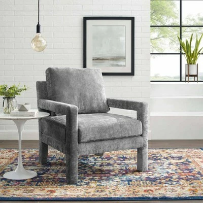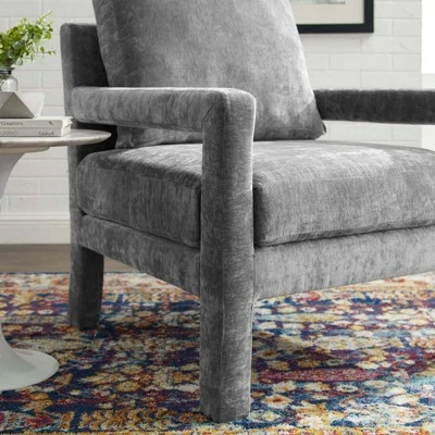Bring the lush expanse of the Rehearse Performance Velvet Living Room Accent Armchair into your environs for an enhanced seating experience. The Rehearse Accent Chair has an elegantly fluid linear frame with padded cutaway open arms. Stain-resistant performance velvet polyester upholstery covers the densely padded foam cushions for a premium living room chair guests will return to time and again. Resting securely on upholstered legs, Rehearse comes with four non-marking foot caps to protect flooring. Assembly Required. Chair Weight Capacity: 300 lbs.