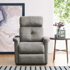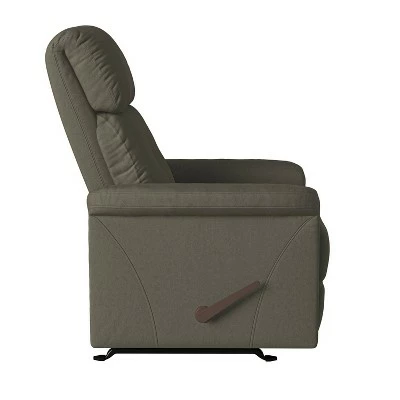 This ProLounger rocker recliner is covered in a gray nubuck fabric in a modern style that will update your home. This comfortable chair allows you the option to either recline back to relax or to rock away your stress while reading or watching tv. This chair provides padding in all the right places for ultimate comfort in your living rooms, bedrooms, theater rooms and media rooms. Full chaise pad between the chair and the leg rest to support the legs for a truly comfortable recline.