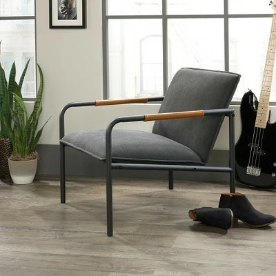 Accentuate your living space by adding style and comfort with this chair from the Boulevard Café collection. This handsome lounge chair features an upholstered cushioned seat and back for comfort you can enjoy while you sit back and read the newspaper or relax while watching the TV. Its two armrests are accented with a leather like wrap for an extra touch of sophisticated style that is sure to catch the eye of all your guests. Attractive from every angle, this mid-century inspired accent chair is the perfect accent no matter where it stands – living room, dining room or office! With its Charcoal Gray upholstery and durable, powder coated black metal frame, this beauty of a chair is just what your home décor is missing.
