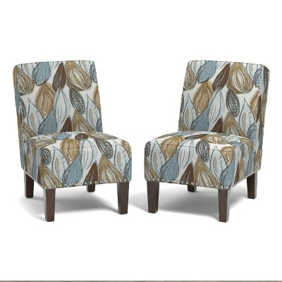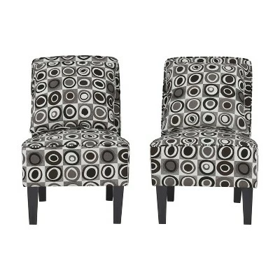 This set of 2 armless slipper chairs feature a curved square back, sinuous springs and deep seating with a thick foam cushion for extraordinary comfort. With dark espresso finish solid wood legs and a designer fabric, these chairs will add just the right touch to a living room, bedroom or office and transform your home.