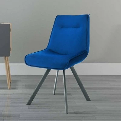Vibrant blue fabric with a soft, velvety texture adds compelling character to this set of two upholstered side chairs. Perfect for an inviting breakfast nook or dining room, the chairs sit on delicate, fin-style splayed legs and add welt trim and a single horizontal tuft. This pair is the perfect way to add vivid color and a welcoming ambiance to your contemporary or mid-century inspired space.