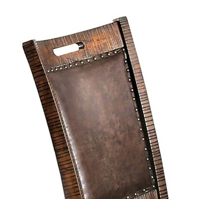 Constructed with Wood, Veneer and Faux Leather this set of two of side chairs will be a perfect fit for your dining space. The Chairs goes well with the Rustic furniture and would create a nice ambiance in your home. It has Padded Leatherette seat with nailhead trim details and also has cushioning for the back support as well. The front legs are Saber in style and the back legs are straight. The grainy wood details adds finishing touch to it.