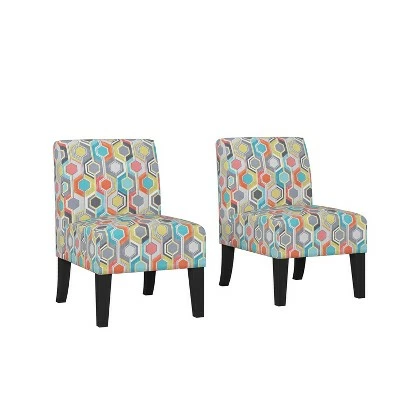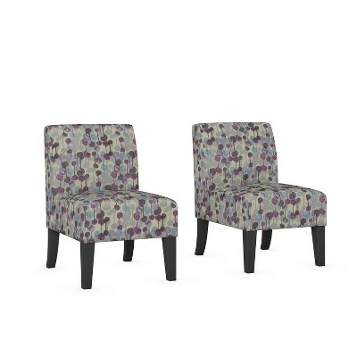 This set of two armless accent chairs are designed to update the look of your home. These slipper styled chairs feature a slightly curved square back, sinuous springs, deep seat cushion and thick foam cushion for extraordinary comfort. Ideal for small spaces, these armless chairs work great in the office, bedroom, dining room or living room.
