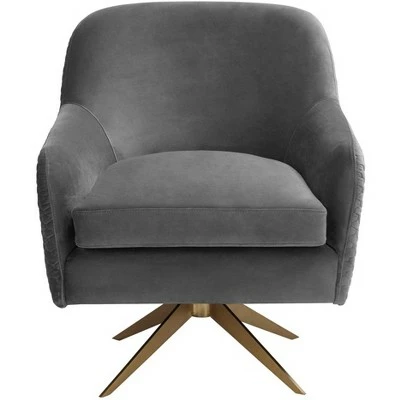 Add an extra seat to a room or seating area with this gray velvet swivel chair from Studio 55D. The legs of this chair are metal and have a lovely gold finish to contrast. This chair has a 360-degree swivel and a reversible seat cushion.