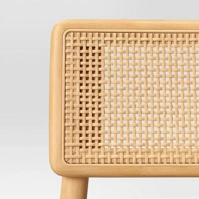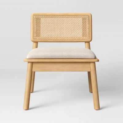 Anchor your home in natural flair and style with the Tarawitt Modern Cane Accent Chair from Project 62™. This armless chair is upholstered in a white textured fabric on a padded seat for comfortable feel as you sit down and relax. The upholstered accent chair is supported on a clean-lined natural-grained wooden frame with angular legs to bring an eye-catching contrast, while the backrest sporting an open-weave cane design offers enhanced visual interest with a beautiful and breezy look.