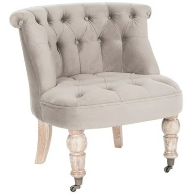 Our Carlin barrel-back tufted chair, upholstered in taupe linen fabric, is full of tradition. Inspired by 18th century English furniture, Carlin features button tufting on the backrest, with rolled top and lovely turned legs crafted from birch wood, shown with washed finish. Perfect as a side chair or bedroom chair, Carlin comes with casters for easy of movement.