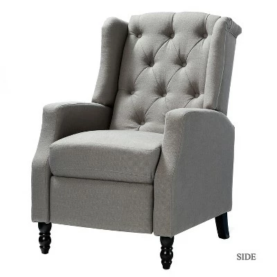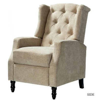 Founded on a solid hardwood frame, a modern take on a classic wing back, this chair boasts accents like thick foam cushioned seat and back with button tufting. Simply push back to recline, no levers or buttons required. Comfortable seat and back support for long-term sitting, TV viewing or a relaxed recline. Clean styling offers a generous seat size and comfort. Great for living room, media, and master bedrooms.Item Size: 27″Wx34.5″Dx41″H, Seat Size:20″Wx22″Dx19.5″H