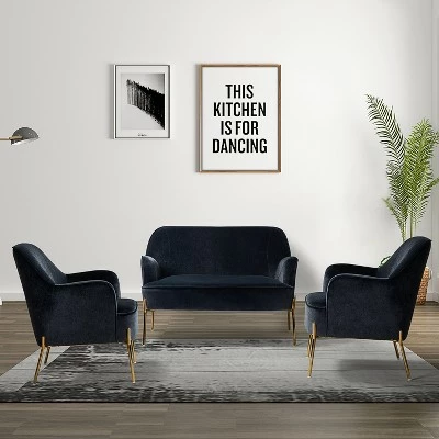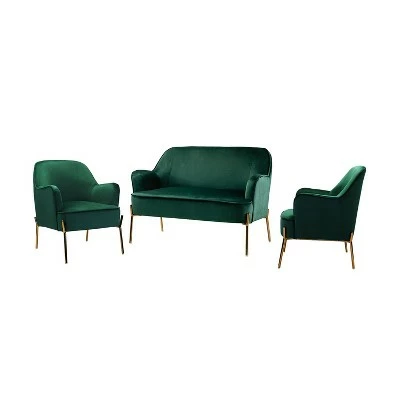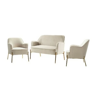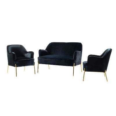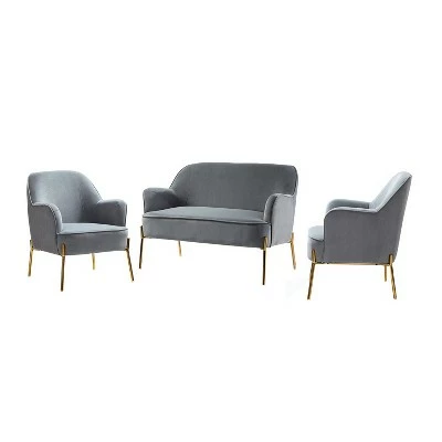 Anchor your living room in trendy, contemporary style with this three-piece living room set, including one loveseat and two matching armchairs. Crafted from solid and manufactured wood, each piece is wrapped in foam-filled velvet upholstery with gold metal legs support. This beauty is luxurious in appearance. Liven up your home with this ensemble to provide a relaxing yet eye-catching addition to your family. Plus, designed in a chic style with piped edges lend a tailored touch. Designed for an inviting conversation for all your guests and family, this charming collection is a good addition to a gathering, which you have been looking for. Simply transform your living room with these statement pieces to add a touch of elegance to your home. Don’t hesitate to add it to your cart!Chair Size: 26″W x30″D x 32″H , Seat size: 18″W x21″D x 18″HSofa size: 43″W x29″D x 32.5″H, Seat size: 42″W x20.5″D x 18″H