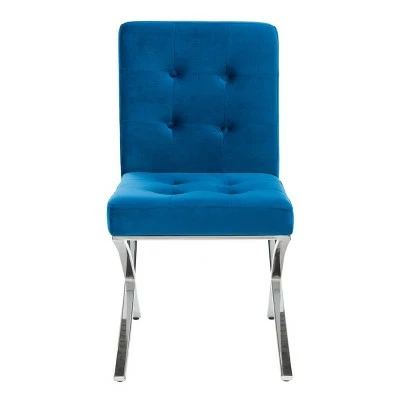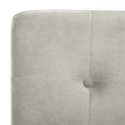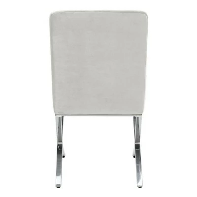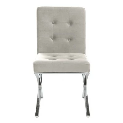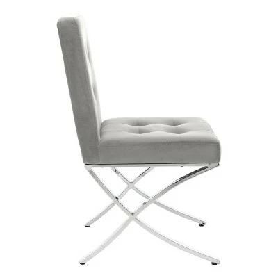 An instant sign of sophistication, this contemporary light gray tufted side chair brings refined relaxation to any living room. Designed with modern geometric lines and generously button tufted velvet style upholstery, its polished chrome legs make it an instant new classic. Constructed from chrome colored iron, this stylish chair is able to support up to two hundred and seventy five pounds. The Walsh tufted chair is the perfect addition for Contemporary, Modern, or Retro style interiors.